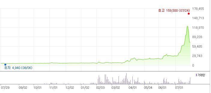 2019년 7월 29 ~ 2020년 7월 28일. 1년간 주가 차트위 그래프를 보듯 2019년에는 주가가 5,000원 근방에서 움직이고 있었으며, 2020년 초 주가는 7,000원대였습니다. 신풍제약은 대부분의 제약 관련 주식이 그렇듯이, 2020년 초부터 코로나바이러스감염증-19 관련하여 바이오 테마주로 취급받으며 조금씩 거래량이 늘고 주가가 올라갔습니다. 5월 13일, 기존 말라리아 치료제 ‘피라맥스’가 코로나19 치료제 임상 2상 시험을 승인받으면서 업계의 주목을 받기 시작했습니다. 또 WHO가 하이드록시클로로퀸의 임상시험을 안전성 이유로 중단하기 전까진 클로로퀸 관련주로 묶이면서 주가가 크게 올랐습니다. 과도하게 주가가 오르자, 7월 22일 증권거래소는 신풍제약을 투자위험종목으로 지정하였으며, 7월 23일은 하루종일 거래가 정지되었습니다. 관련기사거래가 풀린 7월 24일 금요일에도 상한가를 찍으며, 최고점을 경신하고 있었습니다.